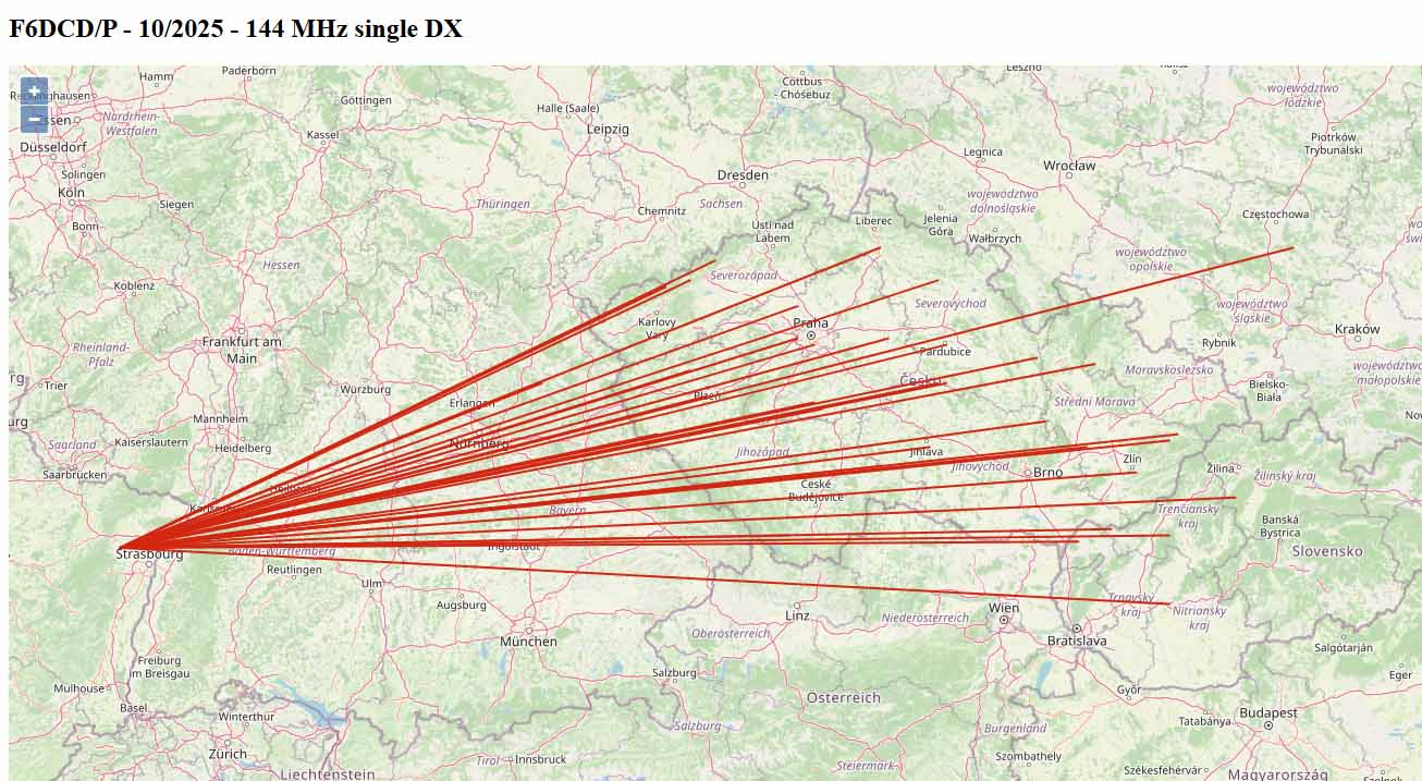 A noter la présence de DR9A qui, comme sur 2 m, avec son signal supérieur à -30 dBm empêchait des qso vers l'Est. On constate le vide de qso au Sud de Prague sur la carte ci dessus.