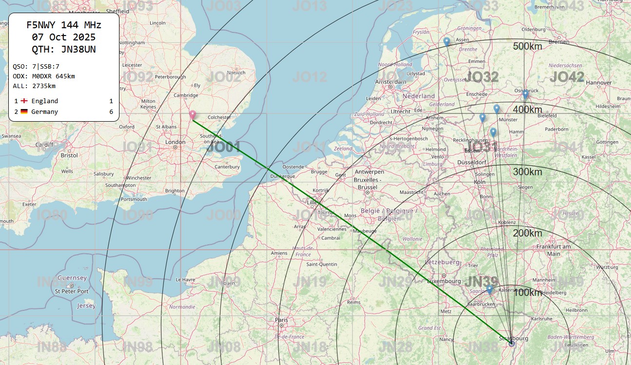 Meilleure distance: M0DXR (JO01DV) à 646 km