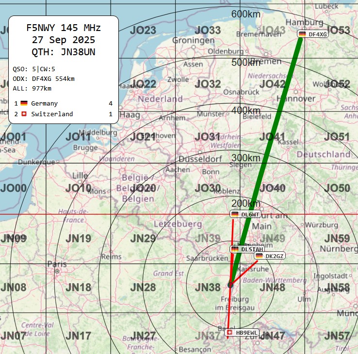 Meilleure distance: HB9XC (JN37MD) à 166 km